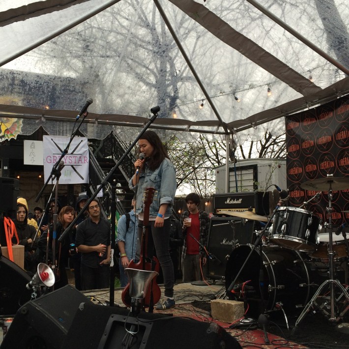 It's impolite to say that someone looks tired, but there's no other way to describe the hardened fatigue clouding Mitski Miyawaki's face when she stepped onto the outdoor stage at Austin's Liberty bar accompanied by her band, Maggie Pakutka and Kat Casale. This was their last SXSW show, and moments before their soundcheck it started to rain. Heavily. Still, the audience crowded around the stage, stooping under the awning if they could, eager to see one of the most exciting emergent acts of last year. When Mitski released her third full-length album, Bury Me At Makeout Creek, in the fall of 2014, she proved that her brand of sad songs shouldn't make you feel sad. Instead, they're triumphant moments of misery exploited by addictive melodies and an unbridled sense of self-imposed empowerment.