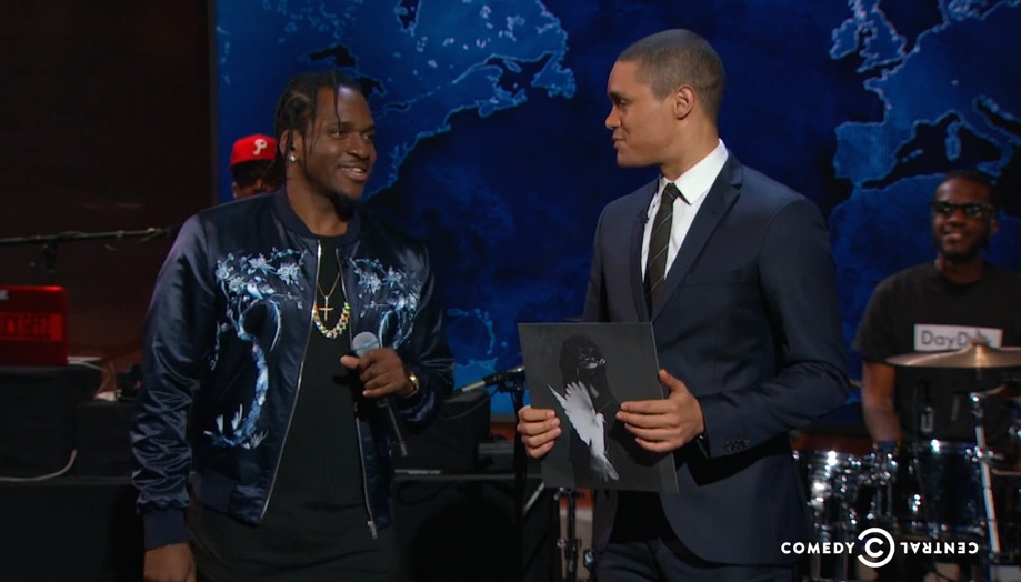 Pusha T's excellent new album Darkest Before Dawn: The Prelude comes out on Friday. And while most of it finds Pusha rapping about his drug-dealing prowess, the album ends with "Sunshine," a song about the sort of oppression and hopelessness that led to the Baltimore Uprising earlier this year. It's a powerful, lyrically dense song, and it's got Jill Scott sounding like Billie Holiday on the chorus. Last night, Pusha was a guest on The Daily Show, and he performed "Sunshine" live for the first time. Jill Scott wasn't there, but he did have a live band with him, and he remains one of the most intense live rappers you will ever see. As an online bonus, he also did the new single "Crutches, Crosses, Caskets." Watch both performances below.