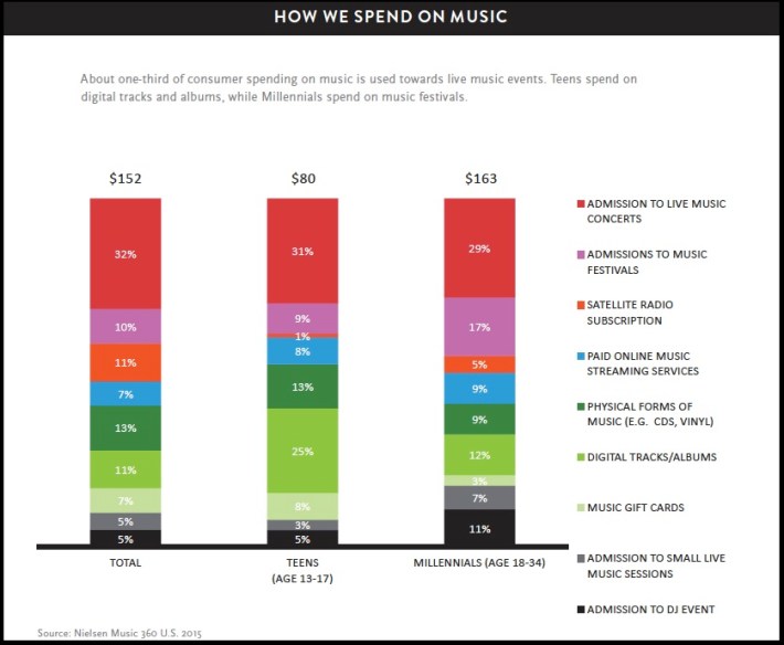 And it's not just MSG! A couple weeks ago, I wrote a story about the 2015 Nielsen Music Report: a 29-page document that presented a tremendous amount of data regarding America's consumption of music. The story I wrote focused primarily on recorded music -- because that's Nielsen's primary focus, too -- so I excluded any mention of their "How We Spend On Music" chart, which took a broader look at the ways in which we, um, spend on music.