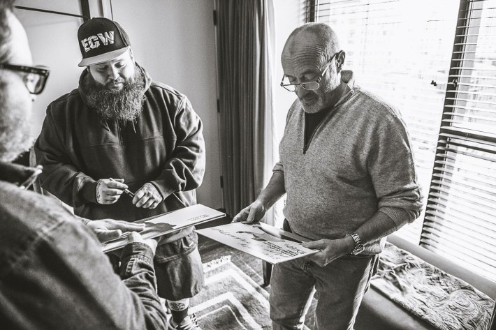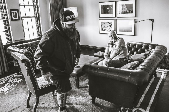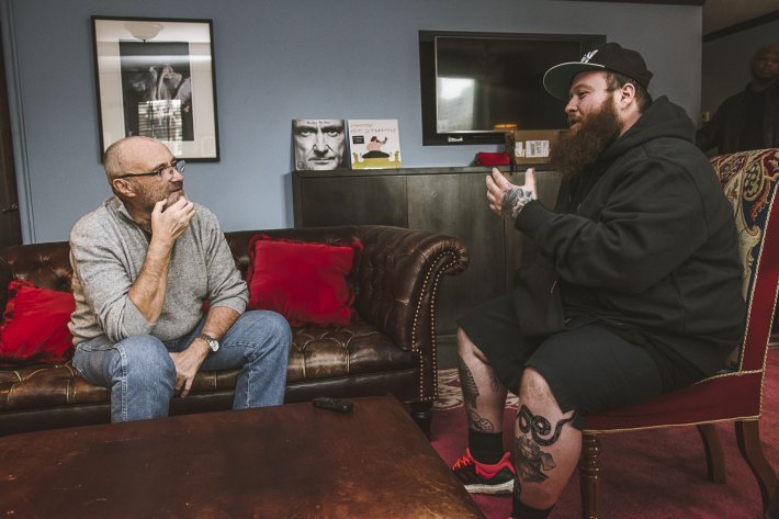 That's why I asked Queens-based phenom Action Bronson to play interviewer when Collins visited New York City last month. The imposing Jewish/Albanian-American chef-turned-rapper spit over "Another Day In Paradise" and "Sussudio" on his 2012 Party Supplies-produced LP Blue Chips 2, and sang and danced along to "Easy Lover" in a recent episode of his food travelogue Fuck, That's Delicious, which now airs on the Viceland network. He is a diehard Phil Collins fan. Bam Bam and Phil hit it off immediately, talking music, cuisine, and, eventually, pimple-popping YouTubes.