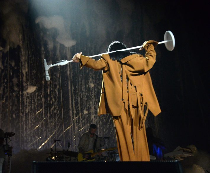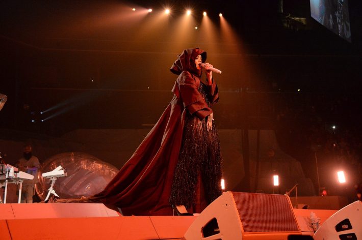 It was a transcendent moment both literally and metaphorically as those emotional ballads gave way too ANTI's "Woo." Off came the white robe, and beneath it Rihanna blessed us all by exposing her beige, leather, ass-less chaps. Those chaps were one of four different costumes Rih donned last night, the best of which was a bustier covered by a brown, oversized men's suit that laced up the back. All of the looks were understated and just-barely dramatic. Members of the live band were sheathed in Jedi-chic, drapey beige, and at one point Rihanna reappeared from a costume change in a brown, floor-length cloak with a constructed hood that made her look like a giant, very, very beautiful insect. She shed it like an exoskeleton to reveal a sequined, tiered black body suit that she gyrated in while performing "Rude Boy" and "Work."