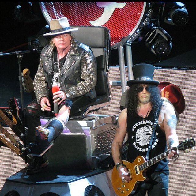 After Dave Grohl broke his leg by falling off the stage last year, he performed a number of Foo Fighters shows seated on a giant motorized throne. Axl Rose recently injured his foot and was told by his doctor not to put too much weight on it, so at Guns N' Roses' reunion show in Las Vegas last night he performed sporting a cast while perched atop a giant motorized throne that looked suspiciously like Dave Grohl's giant motorized throne. As it turns out, it was Dave Grohl's giant motorized throne -- near the end of the set, roadies came onstage to remove a covering from the throne, revealing the prominent Foo Fighters logo underneath. "That's a good advertisement," Axl joked.