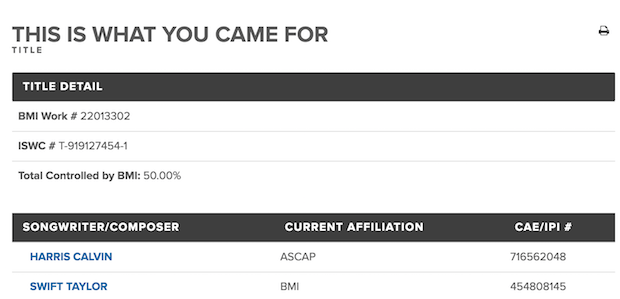 The Taylor Swift/Calvin Harris breakup and beef seems like eons ago with all the recent excitement, but that whole saga is still playing out. Last week, we found out that Swift had co-written Harris' new Rihanna-featuring single "This Is What You Came For," but was credited under the hilarious pseudonym Nils Sjoberg. Now, as TMZ points out, Swift has ditched poor old Nils and has been properly credited under her government name in the BMI database, which tracks songwriting licensees. What could it mean!? Who knows? This train just keeps on rollin' and we're all along for the ride...
