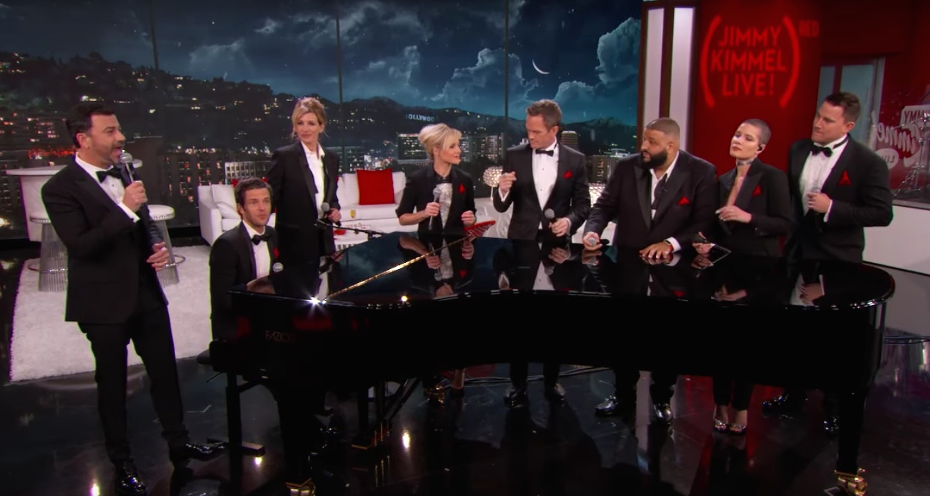 Last night, Jimmy Kimmel aired his second-annual (RED) special, corralling a massive cast of celebrities to help out with AIDS awareness. And as part of the show, Kimmel led a big all-celebrity singalong of a bleakly funny song called "We're Going To Hell" -- the point, pretty much, being that celebrities need causes like AIDS awareness to assuage their own guilt when they're otherwise living in unfathomable luxury. Many of the song's singers were famous actors of one stripe or another: Kristen Bell, Channing Tatum, Julia Roberts, Neil Patrick Harris. But there were music figures up there, too: the Killers, Halsey, DJ Khaled. (It's pretty funny that Khaled, who at least theoretically is a musician, was easily the worst singer on that stage.) Toward the end, Bono shows up in his '90s-vintage MacPhisto character. Watch the big singalong below.