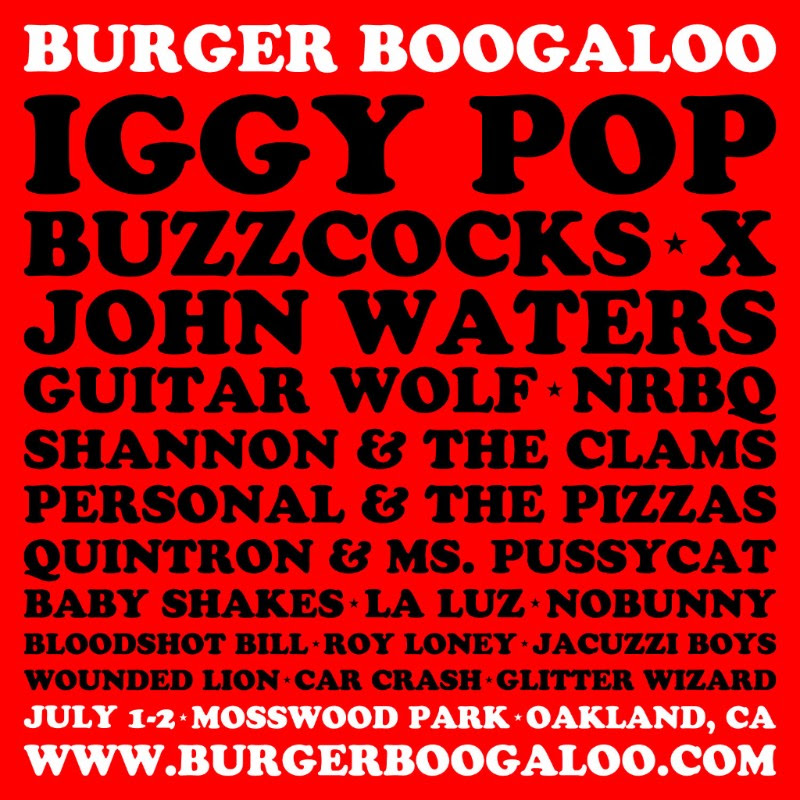 Burger Boogaloo has become a staple of the East Bay music scene. This year, the Burger Records-hosted festival will be celebrating their 5th year at Oakland's Mosswood Park with an impressively stacked lineup headlined by Iggy Pop and the Buzzcocks. John Waters will act as MC, a position he held down for the last two years as well, and the rest of the lineup boasts an assortment of local artists, Burger affiliates, and just excellent musicians, including Guitar Wolf, X, NoBunny, Baby Shakes, NRBQ, Shannon & The Clams, La Luz, Jacuzzi Boys, and more. It's taking place 7/1-7/2, and you can buy tickets here. Check out the full lineup below.