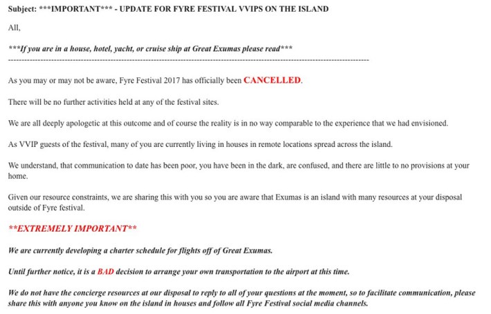 The multiple emails sent by festival organizers to attendees on Friday: