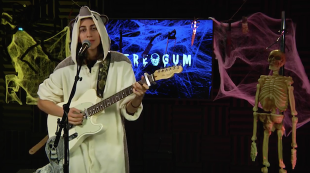 Recent Best New Bands list honoree Common Holly -- aka Montréal-based musician Brigitte Naggar -- just released a new album, Playing House, and she stopped by our NYC offices today to perform a few songs for us. Because it's Halloween and because we love all things spooky, Naggar got in the spirit by dressing up as a rock 'n' roll hedgehog and covering Ozzy Osbourne's "Back On Earth." She also did two songs from her new album, "The Desert" and "New Bed." Watch the full performance below.