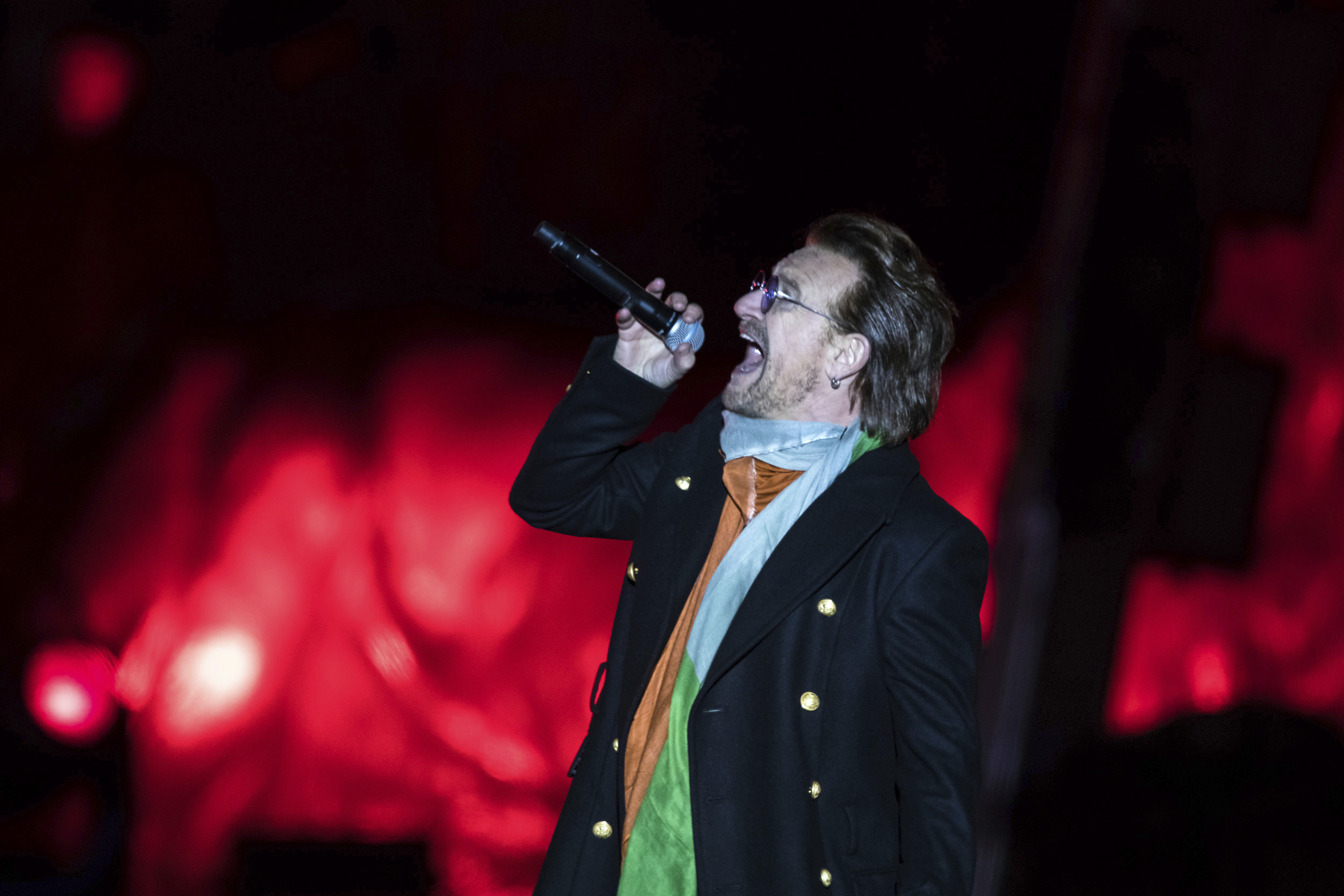 Singer Bono, from the band U2, performs on stage in Trafalgar Square ahead of the 2017 MTV Europe Music Awards, in London, Saturday, Nov. 11, 2017. (Photo by Vianney Le Caer/Invision/AP)