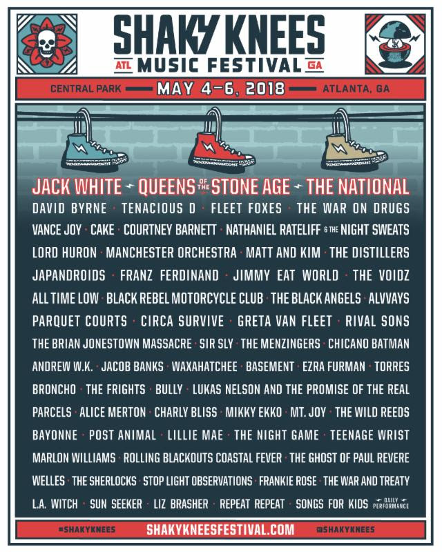 All the bands are at Shaky Knees this year! While other festival are going all-in on dance, rap, and pop, the Atlanta festival Shaky Knees, which has always been heavy on rock, is pretty much straight-up indie this year. That's a good thing! That means it has an identity! This year's festival, which goes down 5/4-6 in Atlanta's Central Park, will have Jack White, Queens Of The Stone Age, and the National as headliners. The show is also the first announced date for the reunited Distillers. And there's a lot to like about the rest of the bill, which features David Byrne, Fleet Foxes, the War On Drugs, Tenacious D, Courtney Barnett, Japandroids, Franz Ferdinand, Jimmy Eat World, Julian Calablancas' Voidz, Alvvays, Parquet Courts, Andrew W.K., Waxahatchee, Torres, Bully, Charly Bliss, Rolling Blackouts Coastal Fever, and Frankie Rose, among many others. Check out all the details here.