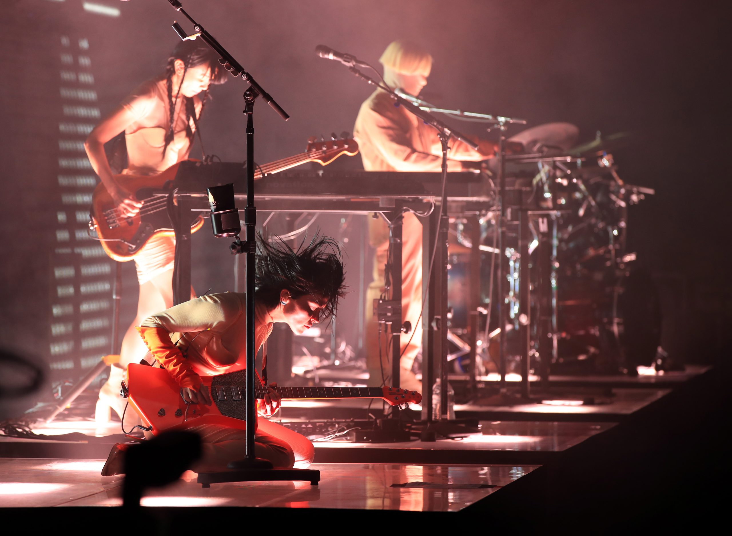 St. Vincent is having a big Coachella. During her set at the festival's opening day last night, she debuted a new live stage show that she's calling "I Am A Lot Like You" after a lyric from her song "Sugarboy." While it's still very much a theatrical performance -- there's intense colored lighting and giant projections on a screen behind her -- it's not a one-woman show like the previous Fear The Future shows in support of last year's excellent MASSEDUCTION album. This time, she was joined onstage by three musicians, two of them wearing masks, who served as her live backing band. "This is just like a blistering, disturbing rock show," she said in a backstage interview Coachella's official livestream.