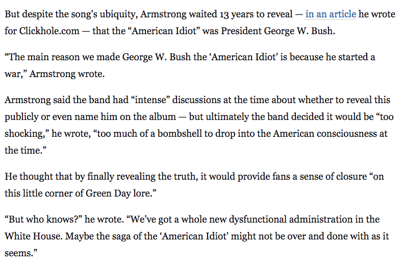 The article is a gag premised on the idea that no one could miss the meaning behind Green Day's heavy-handed 2004 protest song, with faux-Armstrong advising, "Go take a listen to 'American Idiot' with this new info in mind, and I think you’ll find it all starts to finally click." But WaPo's Meagan Flynn took the Clickhole piece at face value, which resulted in the following painfully funny paragraphs, which have now been removed: