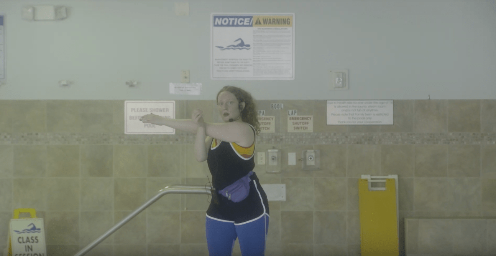 The video begins with Jacobs milling about the house, doing aerobics in the living room while The Parent Trap plays on TV and breaking a screen door. She travels with a rolling backpack down the road and across the beach to an indoor swimming pool where she teaches synchronized swimming to a group of middle-age adults.