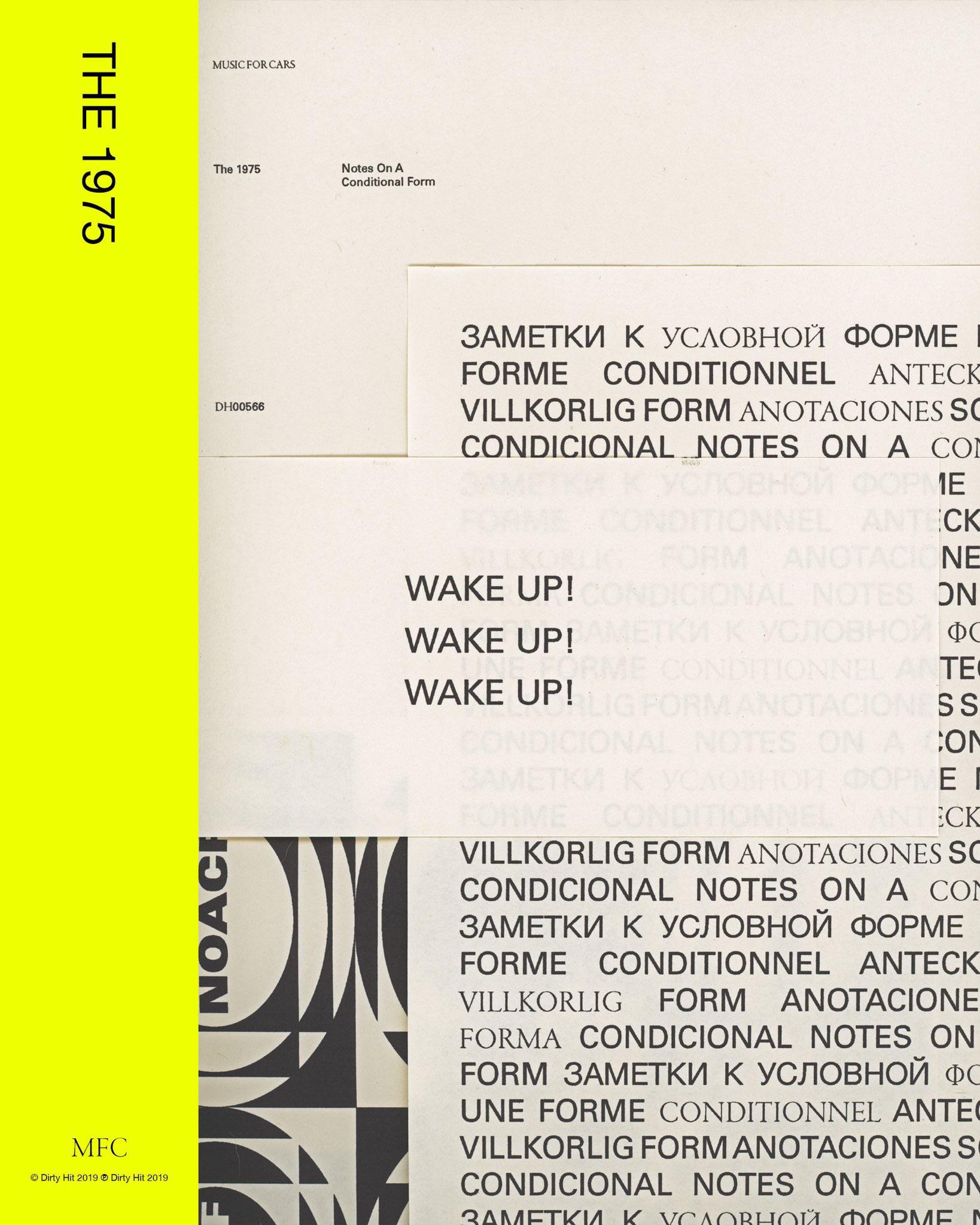 The image reads "WAKE UP!" and "Notes On A Conditional Form" alongside the band's name. In an interview with Zane Lowe last May, Matty Healy soft announced Notes On A Conditional Form as the follow-up to their latest A Brief Inquiry Into Online Relationships. He said we could expect both albums within 12 months. It's been 15 since that announcement, so the new album should be on its way.