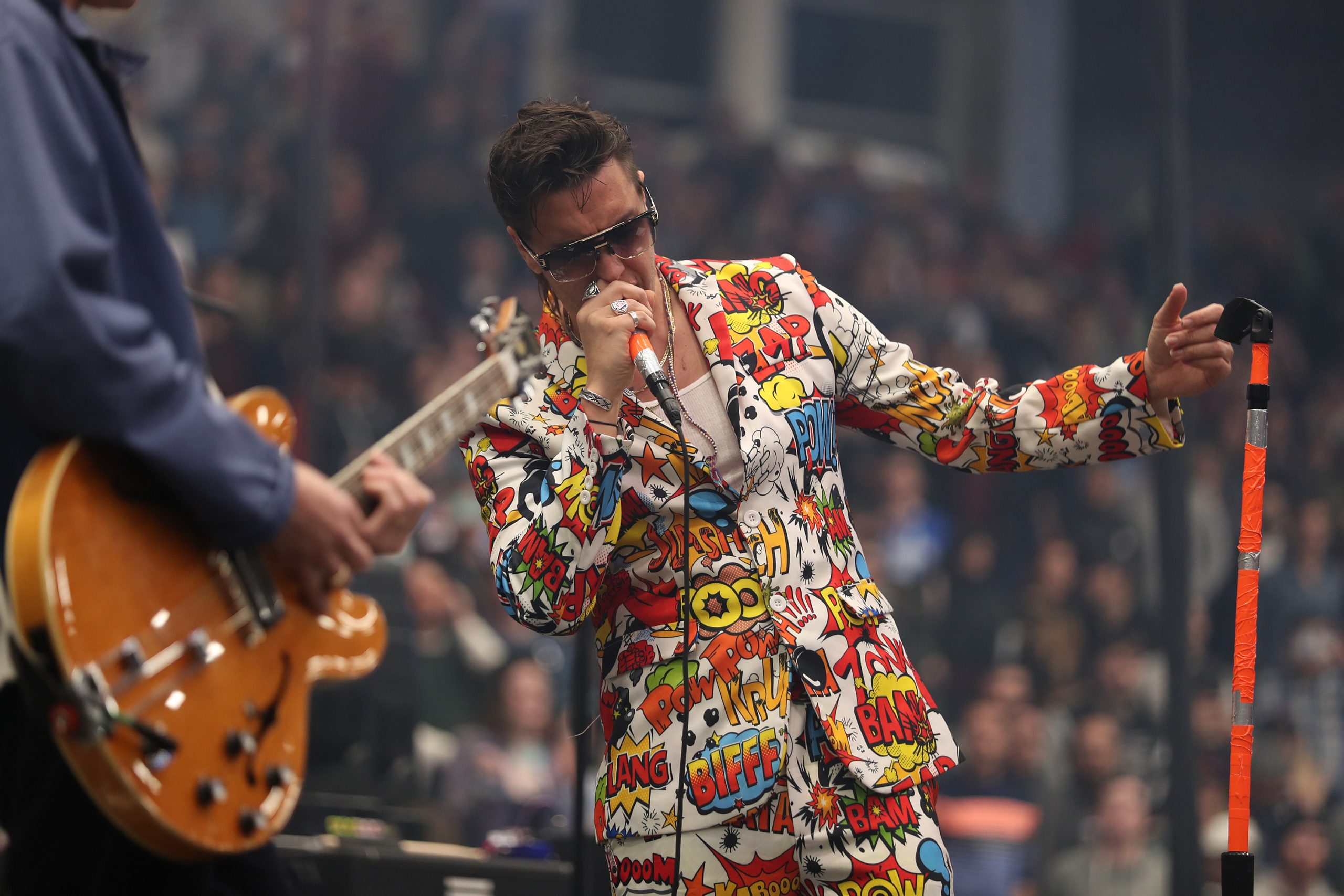 Tonight, the Strokes hit the stage right after speeches from Alexandria Ocasio-Cortez and Sanders himself. There was a sort of big group hug, and the band took their spots, Fab Moretti sitting behind a kit adorned with what social media teasers and posters have suggested is the art for a new album called The New Abnormal. From there, they kicked off a set that opened with a cover of Talking Heads' "Burning Down The House" before sliding into a mixture of old favorites ("Hard To Explain" and "Someday"), pseudo deep cuts ("Killing Lies" and "One Way Trigger"), and new songs including the live debut of "Bad Decisions." (In the past day, there's been a supposed tracklist for The New Abnormal circulating on Reddit -- it includes the previously debuted songs "The Adults Are Talking" and "Ode To The Mets," as well as "Bad Decisions.")