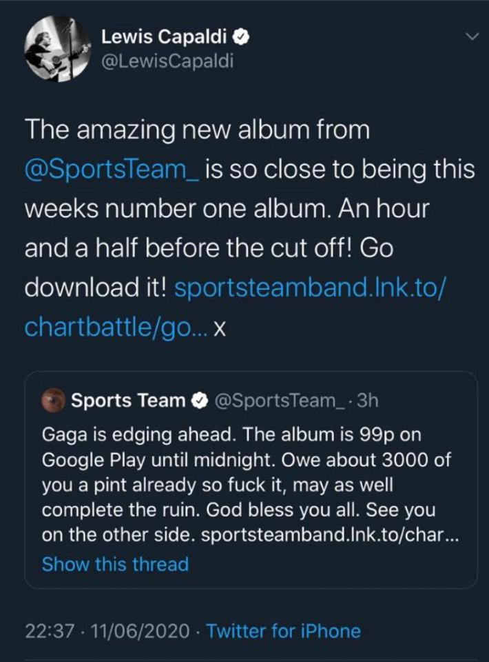 Mostly comprising British teenagers and the band’s friends, the WhatsApp group architected what’s officially referred to within the Sports Team fan community as “The Chart Battle.” In the day before the chart was released, fans launched a Twitter campaign asking people to stream and buy Sports Team, coordinating with the band to promote bundle packages with T-shirts printed with messages from the WhatsApp, buying dozens of copies apiece themselves, and begging celebrities to post about the album. They were amazingly successful, despite infuriating Gaga stans. The Wombats, Sam Fender, Lewis Capaldi, Labour party MP Stephen Doughty and TV weatherman Jeremy Wade, among others, were all moved by the effort and made posts about Deep Down Happy. It’s already gone down in history: Redbrick, the student newspaper of the University of Birmingham, has since published a photo diary of the battle.
