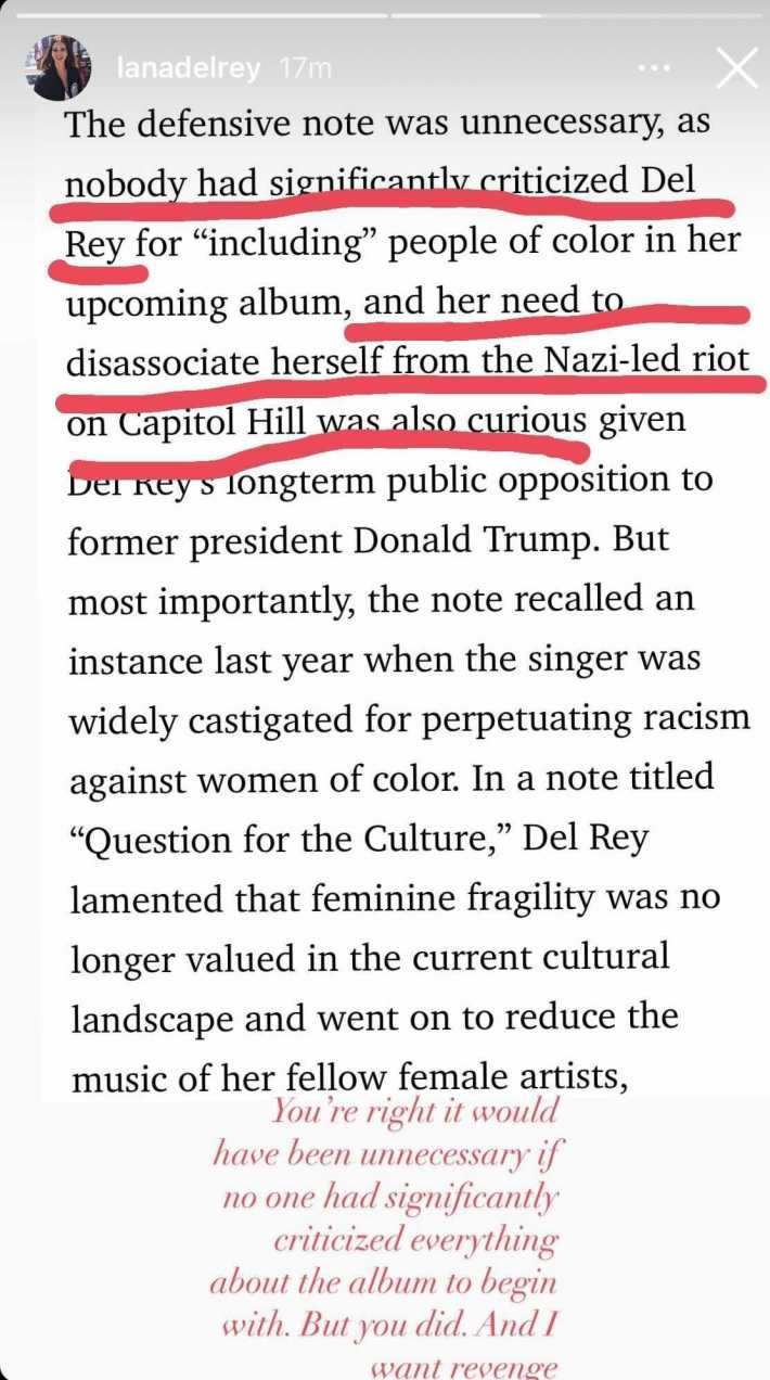 Alongside a screenshot from the article discussing her recent online controversies, she added, "You're right it would have been unnecessary if no one had significantly criticized everythin about the album to begin with. But you did. And I want revenge."