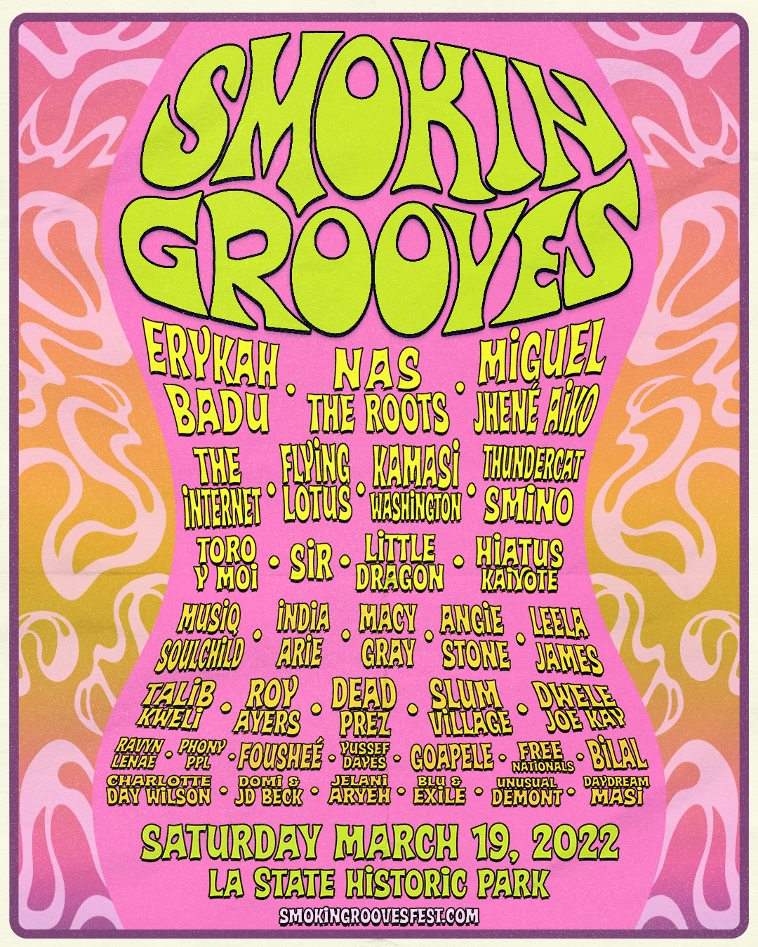 The neo-soul-oriented Smokin Grooves festival will return to Los Angeles this March. The one-day fest will be headlined by an impressive collection of talent including Erykah Badu, Nas, Miguel, the Roots, and Jhené Aiko. Also on deck: The Internet, Flying Lotus, Kamasi Washington, Thundercat, Smino, Hiatus Kaiyote, Sir, Little Dragon, Toro y Moi, Musiq Soulchild, India.Arie, Macy Gray, Angie Stone, Leela James, Talib Kweli, Roy Ayers, Dead Prez, Slum Village, Dwele, Joe Kay, Ravyn Lenae, Phony Ppl, Bilal, Goapele, Fousheé, Free Nationals, Yussef Dayes, Charlotte Day Wilson, Domi & JD Beck, Unusual Demont, Daydream Masi, Blu & Exile, and Jelani Aryeh. See? Smokin! Groovy.