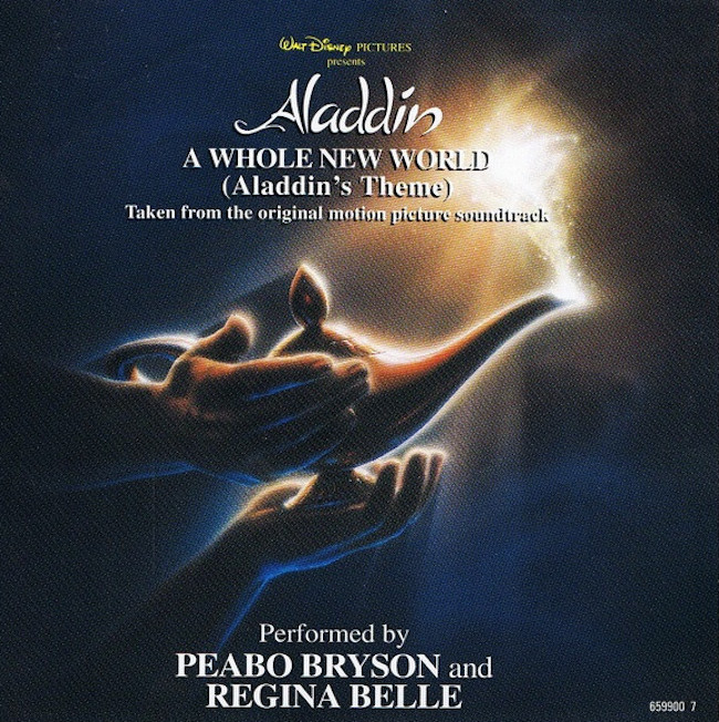 In the context of Aladdin itself, "A Whole New World" is an absolute fucking banger. In the movie, Aladdin and Jasmine are two kids who feel trapped -- Aladdin by poverty, Jasmine by expectation. Aladdin uses his first genie wish and to transform into a prince, which gives him a chance to get close to Jasmine. Together, the two of them find escape in each other. They sing "A Whole New World" while riding a magic carpet all around the planet, seeing the sights. When they're together, they feel like anything is possible, and so everything unfurls in front of them. Menken's music, all weightless strings, gives their optimism a sweeping majesty.