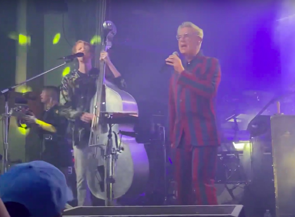 It's a busy time for Arcade Fire. They've got a new album coming out. Their new single is a banger. Will Butler isn't in the band anymore. Last night, the band played their fourth show in a row at New York's Bowery Ballroom. All four shows, announced at the last minute, were Ukraine benefits. At last night's show, the band welcomed their old friend David Byrne, another extremely busy guy, to the Bowery Ballroom stage, and he helped out on a cover of John Lennon and the Plastic Ono Band's 1969 singalong "Give Peace A Chance."