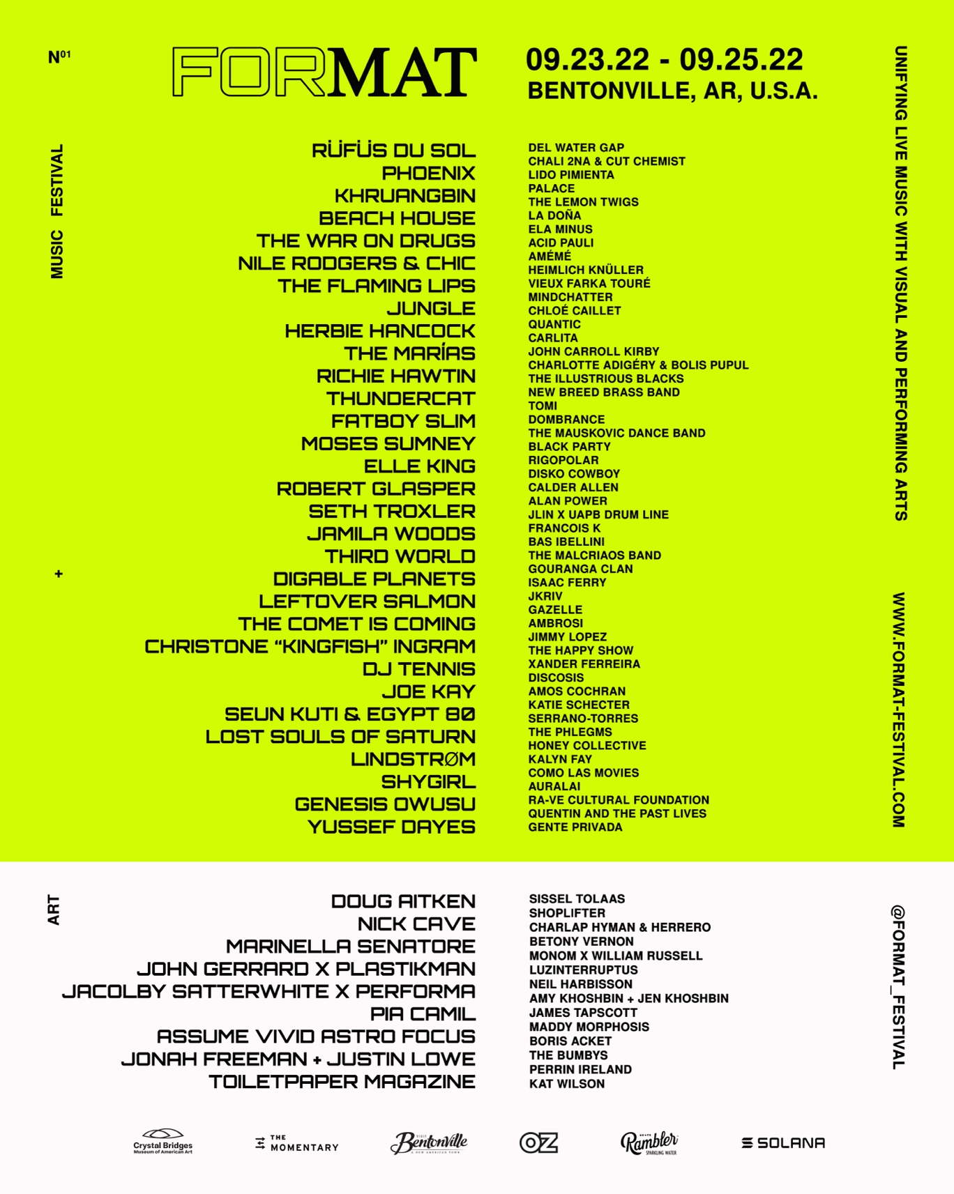 FORMAT is a new festival that will take place this fall in Bentonville, Arkansas, which is located in the Ozarks. The inaugural lineup features Beach House, the War On Drugs, Nile Rodgers and Chic, Herbie Hancock, the Flaming Lips, Phoenix, Khruangbin, Rüfüs Du Sol, Thundercat, Fatboy Slim, Moses Sumney, Robert Glasper, Jamila Woods, Digable Planets, The Comet Is Coming, Shygirl, and more.