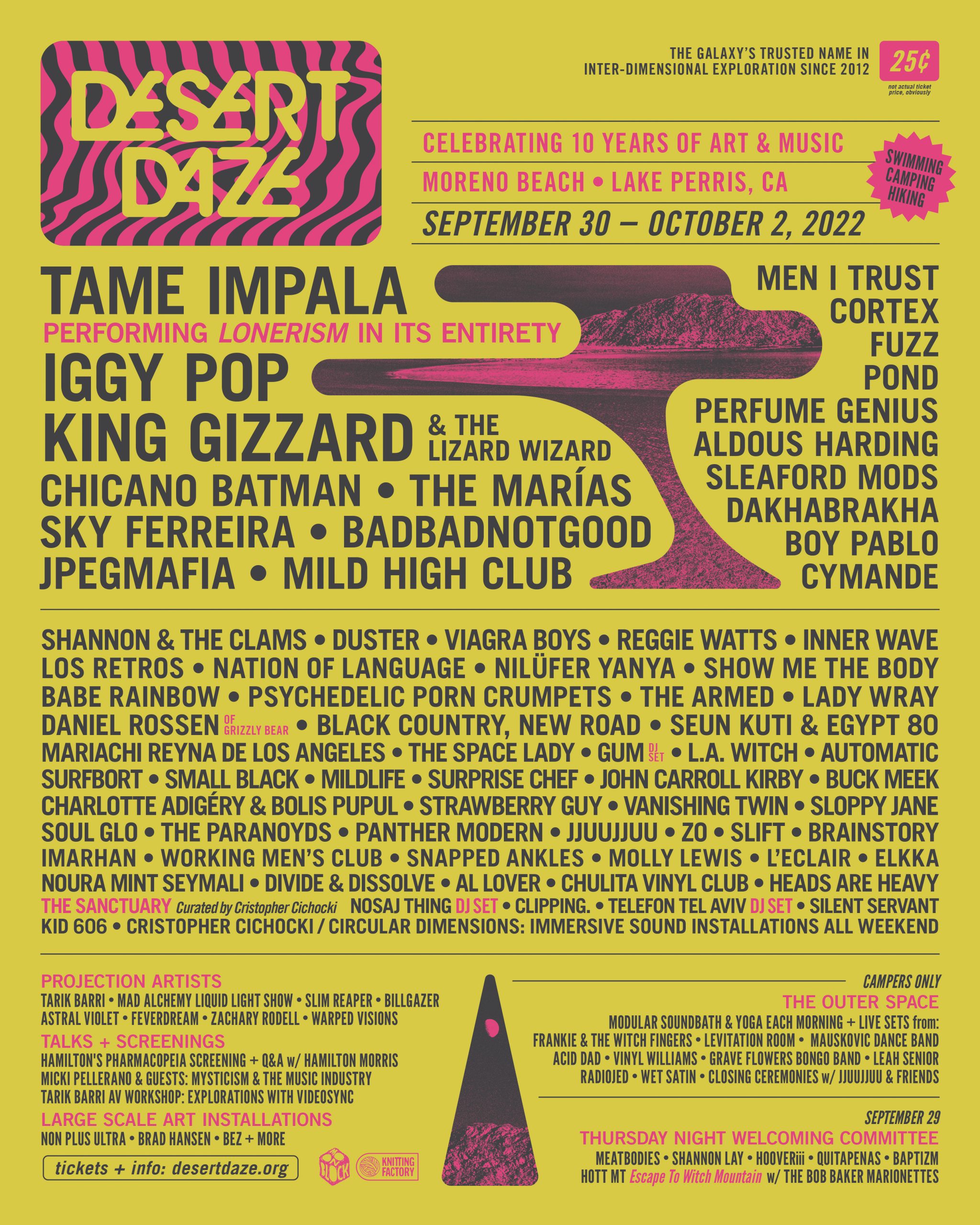 The tenth edition of Desert Daze will take place this September, and the fest has just revealed its 2022 lineup. Headliners are Tame Impala (who will play sophomore album Lonerism in its entirety for its 10th anniversary), Iggy Pop (in his only scheduled North American show this year), and King Gizzard & The Lizard Wizard (performing "an exclusive Southern California set," per a press release).
