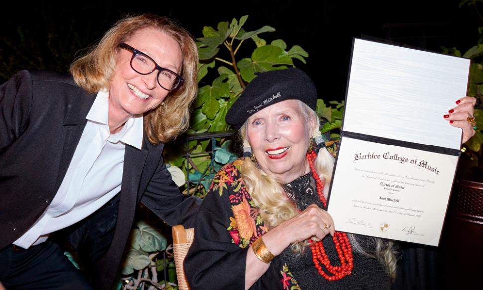 The doctorate was presented by Berklee president Erica Muhl and Terri Lyne Carrington, the founder and artistic director of the Berklee Institute Of Jazz And Gender Justice. "I am thrilled that we are finally able to honor Joni Mitchell," Carrington said during an introduction. "Her career and social principles stand for the values our institute pursues—imagination, freedom, equity, and identity. I can think of no one more deserving."