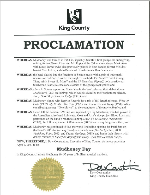 In other Mudhoney news, King County, Washington has declared April 7th "Mudhoney Day" in recognition of the band's 35th anniversary and their contributions to the Seattle grunge scene: