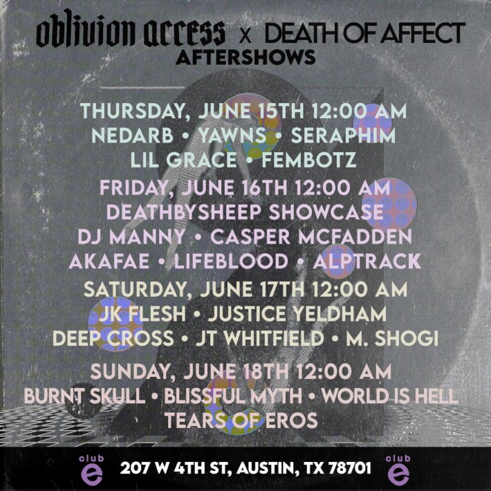 Oblivion Access Festival will also host a one-night-only drag performance at 13th Floor from Louisianna Purchase and a DJ set from SRSQ. There will also be late-night programming all weekend starting around midnight at Club Eternal: Thursday night will have GothBoiClique's Nedarb and Yawns alongside Seraphim, Lil Grace, and Fembotz; Friday will be a Deathbysheep showcase featuring DJ Manny, Casper McFadden, Akafae, Lifeblood, and Alptrack; and Saturday will be headlined by JK Flesh (Godflesh's Justin Broadrick), Justine Yeldham (Lucas Abela), Deep Cross, JT Whitfield, and M. Shgi. Sunday night's late-night programming will conclude with Burnt Skull, Blissful Myth, World Is Hell, and Tears Of Eros
