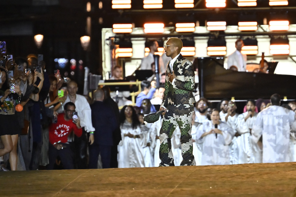 Tonight in Paris, Pharrell Williams launched his first show as Louis Vuitton Men's Creative Director; Williams succeeded the late designer Virgil Abloh in February. Set at the Pont Neuf, the show also debuted a new Clipse song, which is tentatively called "Chains 'N Whips" (it got a mention in a New York Times profile over the weekend). At the show's end, gospel choir Voices Of Fire performed their recent Pharrell collab "JOY (Unspeakable)," and Jay-Z hopped onstage to perform Neptunes classic "Frontin'" and "On To The Next One."