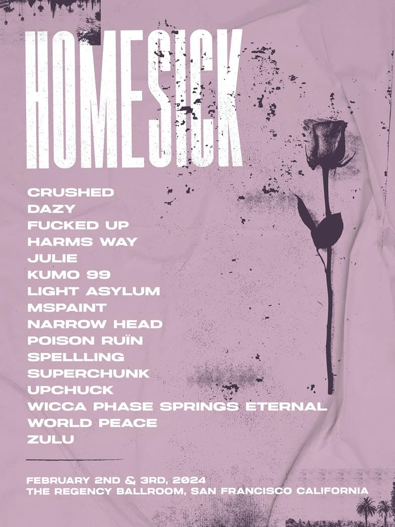 The Homesick Festival, created and curated by Ceremony's Anthony Anzaldo, will return to San Francisco this winter with another lineup that is, indeed, sick. Playing the Regency Ballroom this Feb. 2 & 3 will be a fantastic mix of newcomers and veterans on the punk-to-indie-rock spectrum: Superchunk, julie, SPELLLING, Fucked Up, Wicca Phase Springs Eternal, Harms Way, Light Asylum, Narrow Head, Zulu, MSPAINT, World Peace, Kumo 99, Poison Ruin, Upchuck, Dazy, and Crushed. Tickets go on sale Tuesday, Nov. 15 at 10AM PT. Check out the daily lineups below and start budgeting for your trip now.