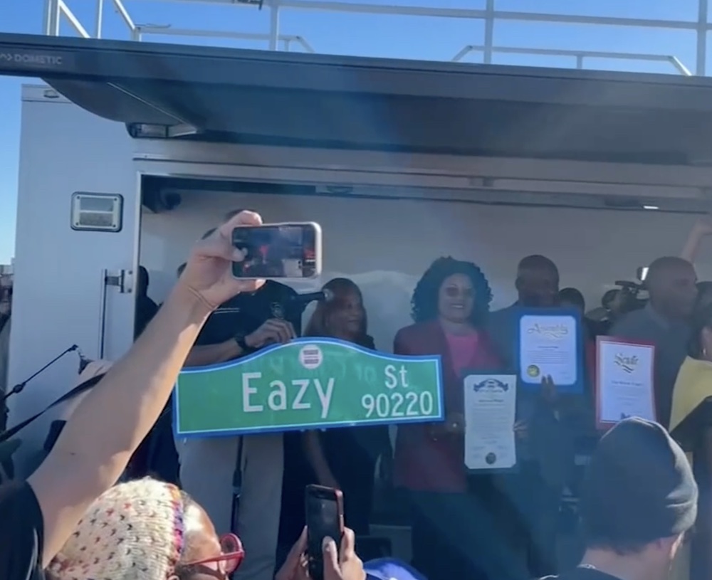 A Compton street has been renamed in honor of the late Eazy-E, as ABC reports. As of yesterday, the 100 block of Auto Drive South is officially named Eazy Street. Compton mayor Emma Sharif, members of city council, and some of Eazy-E's family were in attendance for the ceremony.
