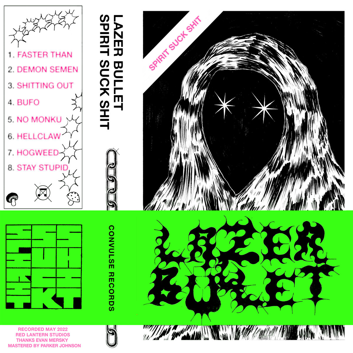 The Portland band Lazer Bullet make raw, frenzied, distortion-bombed hardcore like something that might come out on La Vida Es En Mus. In truth, their debut EP Spirit Suck Shit is out today on Convulse. The vocals are demonic yelps and yowls, the music is like elemental rock 'n' roll blasted to in-the-red extremes, and the song titles are shit like "Demon Semen," "Hogweed," and "Stay Stupid." Rage to Spirit Suck Shit below.