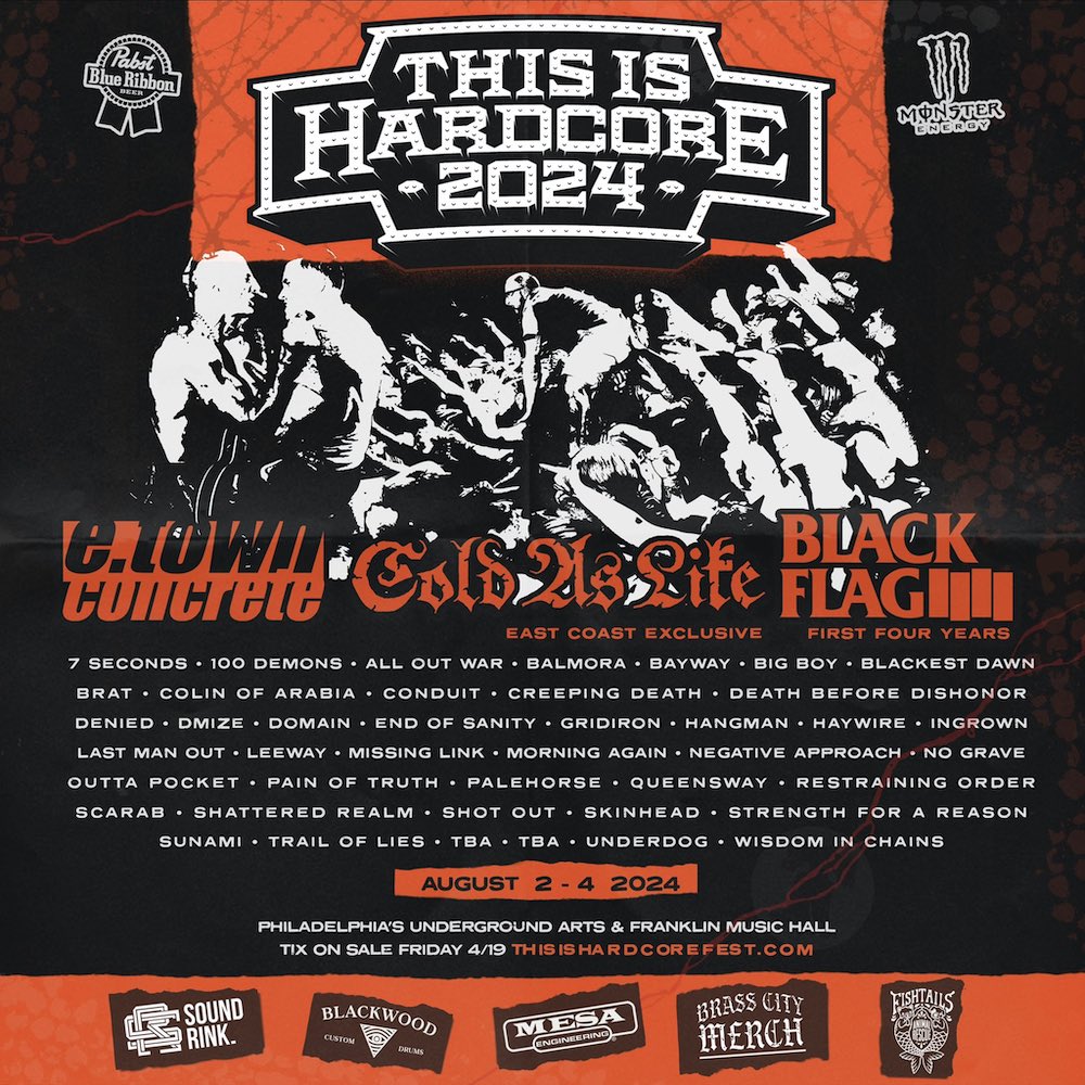 This year's This Is Hardcore, which has nothing to do with the Pulp album, goes down 8/2-4 at Philadelphia's Underground Arts and Franklin Music Hall. Two of this year's three headliners are notorious '90s bruisers: New Jersey rapcore bruisers E.Town Concrete, whose singer Anthony Martini was behind the whole fracas with AI rapper FN Meka two years ago, and Detroit destroyers Cold As Life, one of the most legitimately terrifying groups in the history of the genre. The other headliner is the current version of Black Flag, which is playing a First Four Years set.