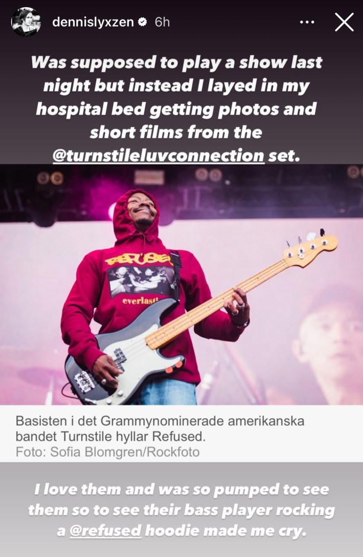 Dennis Lyxzén has always been a complete animal onstage. In Refused and in other projects like the (International) Noise Conspiracy, he throws himself around with total abandon. He's only 51. Here's hoping he gets well soon.
