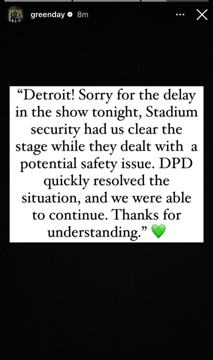 At Comerica Park, concertgoers were left confused when someone pulled Mike Dirnt offstage, and the rest of the band followed. A show pause transpired for five minutes, then the group returned without explanation. After the next song, "Welcome To Paradise," Billie Joe Armstrong proclaimed, "There’s no motherfucker that's gonna stop us, I'll tell you that!" Afterward, they shared a statement on their socials: "Detroit! Sorry for the delay in the show tonight, Stadium security had us clear the stage while they dealt with a potential safety issue. DPD quickly resolved the situation, and we were able to continue. Thanks for understanding."