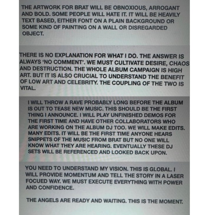 The best album of the year doesn't happen by accident. Charli XCX knows this, which is why she outlined a whole manifesto ahead of the release of Brat. Written last year and shared the other day on her not-so-private-these-days Instagram account @360_brat, it promises "obnoxious, arrogant, and bold" album artwork that "will be heavily text-based, either font on a plain background or painted on a wall or disregarded object.”