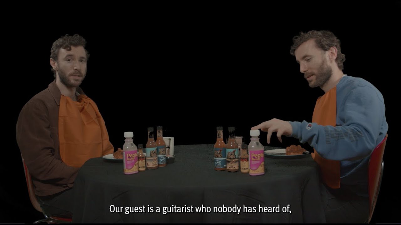 In director Josiah Lydon's clip, Winter guests on a spoof episode of Hot Ones, the popular online video series in which celebrity guests are interviewed while consuming chicken wings slathered in increasingly spicy hot sauces. He plays both himself and the host, who in this case makes a big deal about being in the know despite Winter's obscurity. "Our guest is a guitarist who nobody has heard of," he announces, "but I have!" Later, he inquires, "So tell us about the new record. I know nobody else knows about your music, but, you know, what can I expect?"