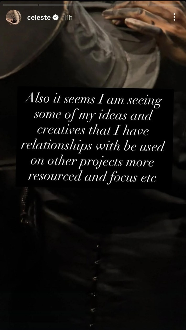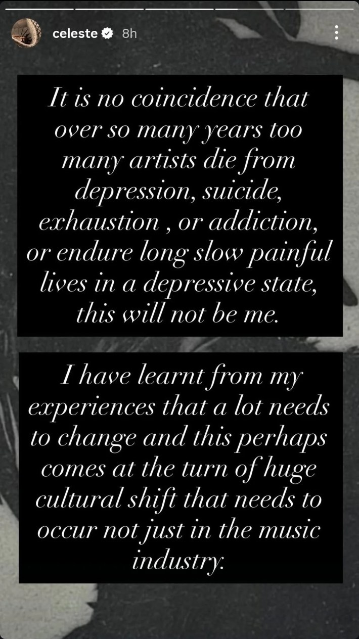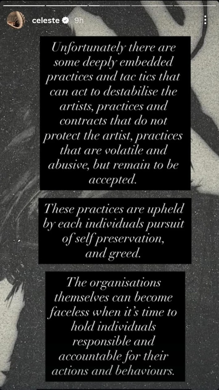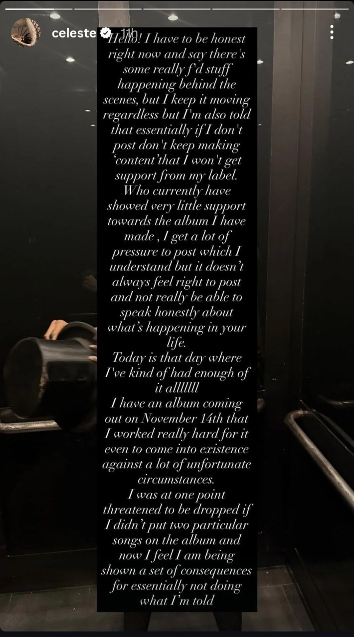 On her Instagram story yesterday, Celeste wrote about the "unfortunate circumstances" surrounding her new LP's release. She says that PolyDor, her label, threatened to drop her if she didn't include two songs, that she has been shown "very little support" for the record, and that she believes she's "being shown a set of consequences for essentially not doing as I was told." Here's what she wrote: