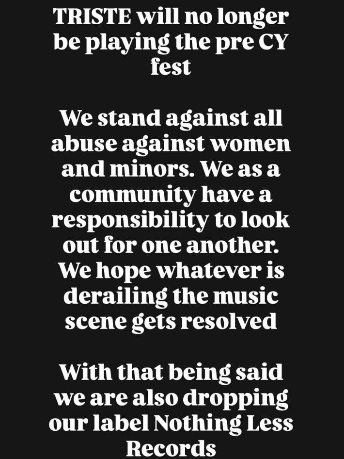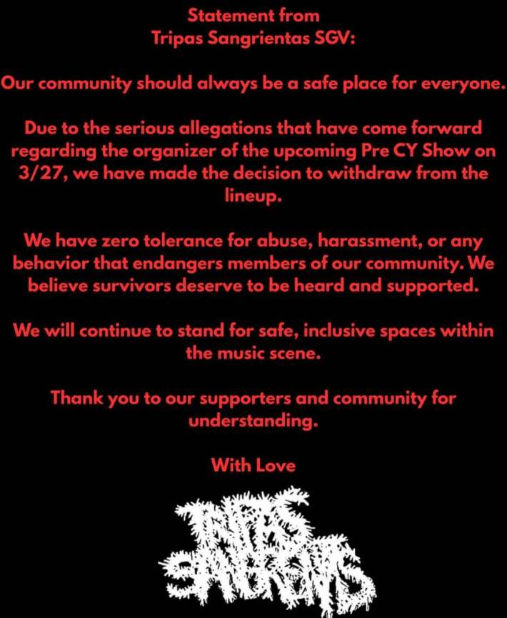 Since those allegations emerged, bands like Iron Lung, Tørsö, Apartment 213, and Tripas Sangrientas have canceled plans to play CY Fest, most of them without much in the way of further comment. Rodriguera has not publicly addressed the allegations.