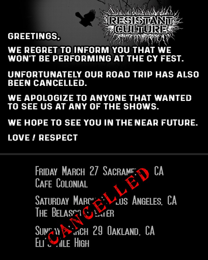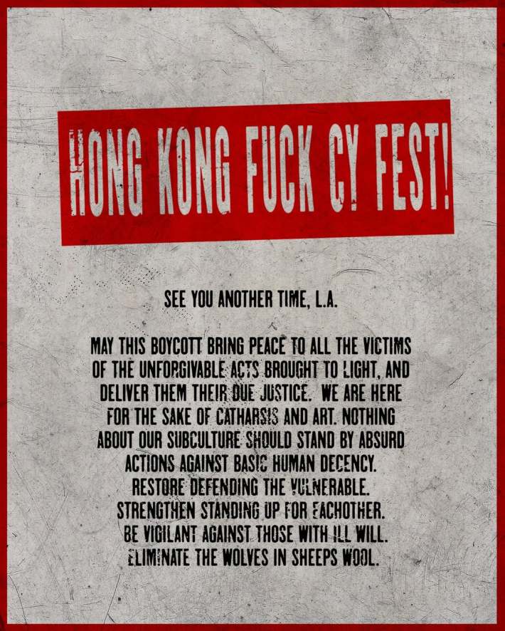 In the days following, Resistant Culture, Triste, Dropdead, Antichrist Demoncore, Hell Fire, Weekend Nachos, Ghoul, Haggus, Hong Kong Fuck You, Bomber, Dr. Know, and Mess also canceled Saturday and pre-fest appearances, and Heath deleted his video and posted a new one.