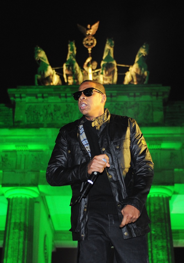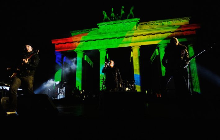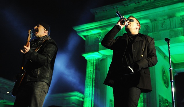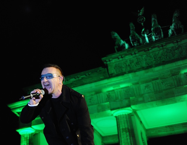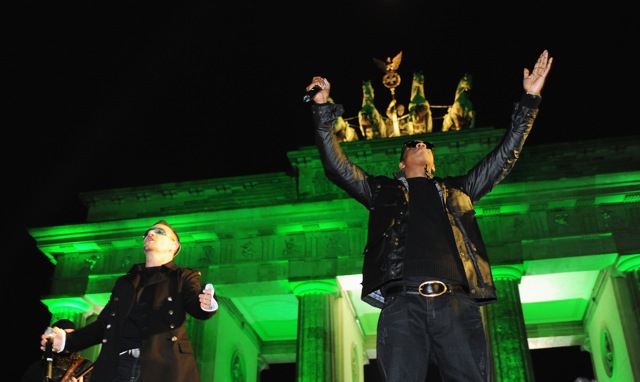 In conjunction with yesterday's 16th annual European Music Awards, MTV set up a special, free U2 concert at the Brandenburg Gate to celebrate the 20th anniversary of tearing down the Berlin Wall. And in order to secure the premises or whatever, MTV set up a special Berlin wall of their own, a metal barricade that ran the perimeter of the concert grounds and kept out people who hadn't registered online for a free ticket. A wall keeping people out from freedom? Yes, irony and outrage galore. But those that were lucky enough to be on the right side of the wall were treated to a six-song set of U2's classics, kicking off with Bono yelling "Berlin, Du bist wunderbar!" (Berlin, you are wonderful!)(better than calling yourself a jelly donut) and highlighting with Jay-Z joining the band on "Sunday Bloody Sunday." It's not the first time he's rapped over the song (that'd be at last year's Glasto), but now you can see it happen live, all the principals in place and filmed all nice and MTV-like: